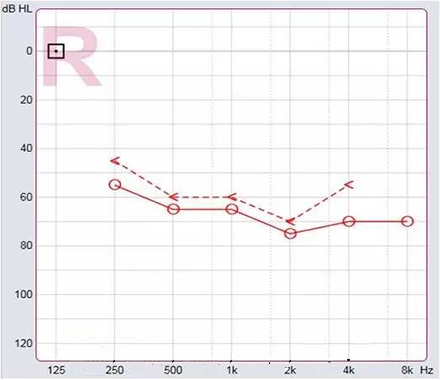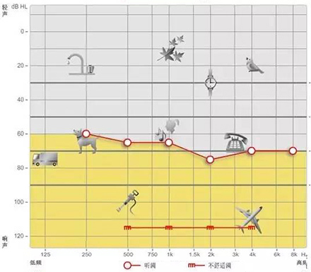 純音測試聽力圖的橫坐標為頻率,從左至右表示測試聲的頻率從低到高,即125Hz至8000Hz;縱坐標為強度,從上至下表示受試者能聽到的最小的聲音強度,以dBHL為單位。如下圖所示:</p><p> </p><center><img alt="" src="/upfiles/201903250213137760.png" width="440" height="400" /></center><p></p><p> 聽力圖的畫法自從1943年在C.C.Bunch的著作中出現后,至今沒有改變。通常右耳的測試結果用紅色表示,左耳用藍色。下圖是ASHA(1990)建議使用的各種標記符號,這些符號已在世界各地廣泛使用。</p><p> </p><center><img alt="" src="/upfiles/201903250213216822.png" width="440" height="250" /></center><p></p><p> 純音測試的測試項目有氣導、骨導、舒適閾與不舒適閾。那么這簡簡單單的聽力圖在驗配過程中有哪些重要作用呢?</p><p> 1、確定聽力損失程度</p><p> 按照世界衛生組織(WHO)1997年的標準,根據0.5kHz、1kHz、2kHz、和4kHz氣導平均聽閾值,將聽力損失分為輕度、中度、重度和極重度。</p><p> </p><center><img alt="" src="/upfiles/201903250213312187.png" width="440" height="180" /></center><p></p><p> 世界衛生組織(WHO-1997)的聽力障礙分級標準</p><p> 舉例</p><p> 下圖為某一聽力損失者所測得的聽力圖</p><p> </p><center><img alt="" src="/upfiles/201903250213367902.png" width="440" height="380" /></center><p></p><p> 0.5kHz的聽閾為65dBHL,1kHz的聽閾為65dBHL,2kHz的聽閾為75dBHL,4kHz的聽閾為70dBHL。則平均聽閾為(65+65+75+70)/4=68.75。將68.75dBHL代入以上分級表格,得到該聽力損失者的損失程度為重度。 聽力損失程度的確定有利于確定助聽器的功率。</p><p> 2、判斷聽力損失性質</p><p> 根據氣導、骨導的關系,可將聽力損失分為傳導性聽力損失、感音神經性聽力損失及混合性聽力損失。</p><p> 骨導與氣導之差大于10dB,且骨導在正常范圍內為傳導性聽力損失,表明聽力下降是由外耳、中耳病變引起。</p><p> 氣骨導一致(≤10dB)且都在正常范圍之外為感音神經性聽力損失。表明聽力下降是由耳蝸、聽神經損傷引起。</p><p> 骨導與氣導之差大于10dB,但骨導在正常范圍之外為混合性聽力損失,表明以上兩種聽力損失均有,由上述多種部位病變引起聽力下降。確定聽力損失性質還需結合臨床表現,也有助于助聽器佩戴效果的預測。</p><p> 3、解釋聽力損失者的日常生活困難</p><p> 聽力損失者在日常生活中經常遇到的問題有1)時而聽得到,時而聽不到;2)聽得到,聽不清;3)小聲聽不到,大聲受不了。</p><p> 時而聽得到時而聽不到</p><p> 以下圖平坦型聽力曲線為例,當周圍言語聲高于其聽閾,即處于曲線下方區域時,該聽力損失者能聽到;當周圍言語聲低于其聽閾,即處于曲線上方區域時,聽力損失者則聽不到對方的說話聲。此為“時而聽得到,時而聽不到”。</p><p> </p><center><img alt="" src="/upfiles/201903250213445950.png" width="440" height="340" /></center><p></p><p> 聽得到 聽不清</p><p> 中文漢語元音輔音的頻率及響度有其分布圖,如下圖所示。以陡降型聽力曲線為例,該聽力損失者聽不到大部分的輔音。聽得清不清楚,主要取決于高頻輔音聽得到聽不到。例如該聽力損失者“g”、“ch”聽不到,但“u”能聽到,因此,他會將“姑姑”、“出租”都聽成“uu”。聽不清楚時,再結合口型,前后句的冗余度猜測。猜對則談話繼續,猜錯則打岔。兒童聽力曲線若是如此,長期接收不正確的語音,會出現口齒不清。</p><p> </p><center><img alt="" src="/upfiles/201903250213526855.png" width="440" height="340" /></center><p></p><p> 小聲聽不到 大聲受不了</p><p> 小聲聽不到,大聲受不了是重振現象。以下圖聽力曲線為例,“飛機”處于不舒適閾附近,聽力損失者對“飛機”的聲音聽著受不了。另外,該聽力損失者聽不到“手表”等聲音。</p><p> </p><center><img alt="" src="/upfiles/201903250214013300.png" width="440" height="385" /></center><p></p><p> 為了更好地使聽力損失者家屬明白聽力損失者的困難,目前有較多的工具可以模擬聽力損失狀態下的溝通與交流。</p><p> </p><center><img alt="" src="/upfiles/201903250214075950.png" width="440" height="370" /></center><p></p><p> 比如,在聲音樣本中選擇“餐廳”,并選擇“正?!?,可聽到正常聽力者在“餐廳”環境中聽到的聲音;若選擇“患者”,則可使聽力正常者聽到聽力損失者聽到的聲音,令聽力正常者親身體驗他們所處的“模糊世界”。</p><p> 在“典型聽力圖”中,有“輕度”、“中度”、“重度”、“極重度”、“陡降型聽力”等選項,若選擇“重度”,則可體驗重度聽力損失者所聽到的聲音。</p><p> 4、調試</p><p> 聽力圖在助聽器驗配調試過程中也起著非常重要的作用。</p><p> 首次驗配</p><p> 助聽器處方公式結合聽力圖計算出聽力損失者的目標增益,為驗配師的進一步調節奠定了基礎。聽力圖結果越準確,首次驗配的滿意度越高。</p><p> 調試</p><p> 在助聽器調試過程中,不能忽視聽力圖的作用。舉一實例:下圖為某助聽器佩戴者的聽力圖,經過多次降低高頻增益,仍反應聲音刺耳。通過對聽力圖的觀察,該佩戴者2kHz處的聽閾較高,且2kHz處的增益亦較多。將2kHz處的增益降低后,助聽器佩戴者的滿意度提高。</p><p> 讀懂聽力圖是驗配助聽器過程中非常重要的一環,只有讀懂聽力圖并解釋清楚聽力圖,對成功驗配助聽器可達到事半功倍的效果。在助聽器驗配調試環節,亦不能忽視聽力圖。聽力圖在整個助聽器驗配過程中起到不可替代的作用。</p><p> 更多詳情請登錄聽覺有道助聽器m.huiyoutank.com</p>" />