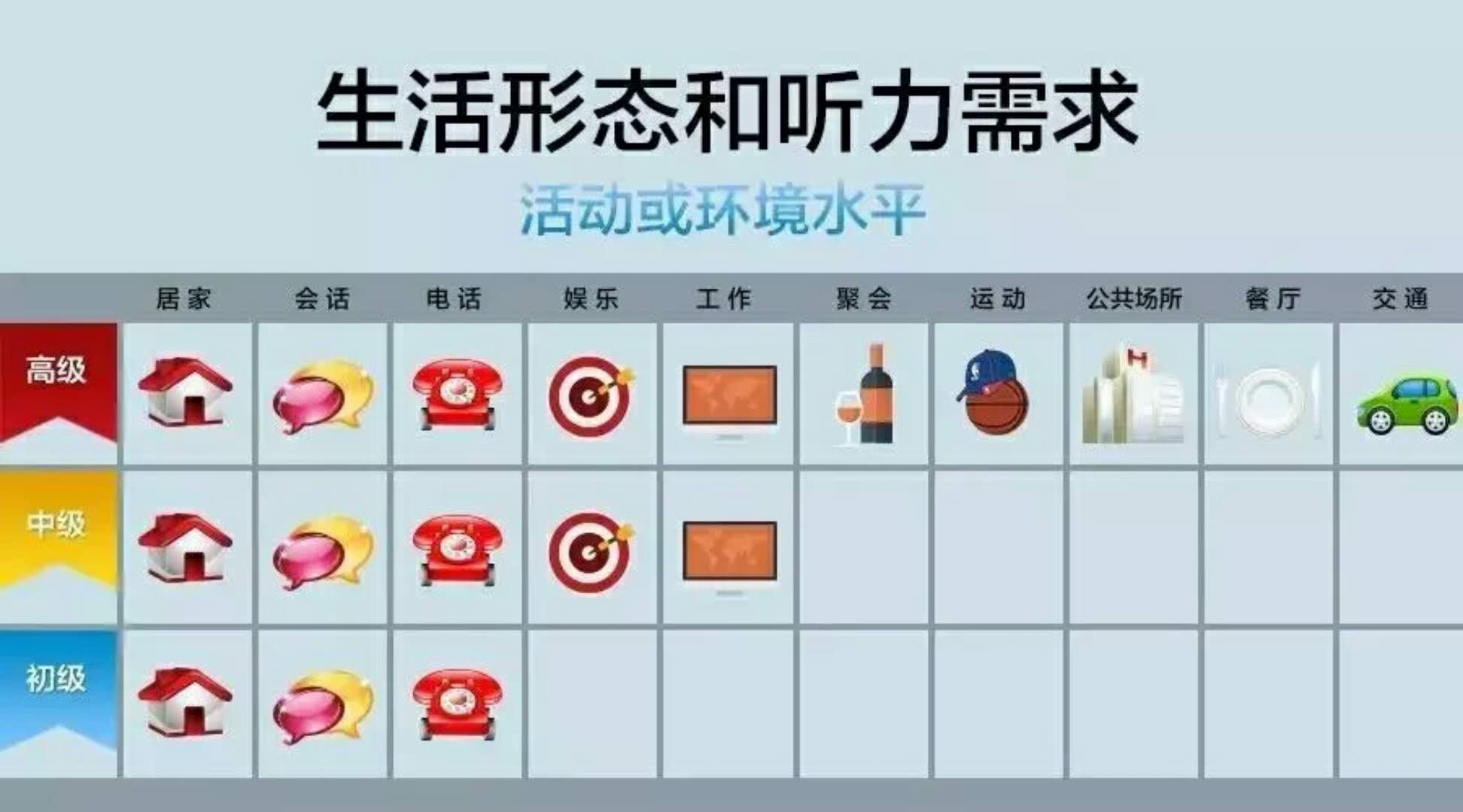 圖中最左面的那一列是助聽器的級別,前面說了,大概分為三等,橫向的就是需求。