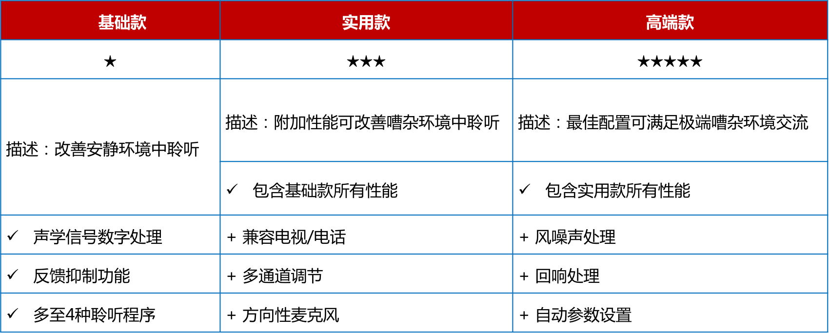 <span style="font-size:16px;"> 助聽器價格取決于機器的檔次,而檔次由內含的技術種類決定。助聽器檔次大致可分為基礎款、實用款、高端款。這三種檔次的區別請參見下表:</span></p><p style="text-align: center;"><span style="font-size:16px;"><img src="/upfiles/201808150226553383.png" width="640" alt="" /><br /></span></p><p><span style="font-size:16px;"> 那么,如何應該選擇哪種檔次的助聽器呢?</span></p><p><span style="font-size:16px;"> 選擇助聽器時主要需要考慮兩大因素。首先要考慮的就是弱聽人士的聽力損失程度,其次要考慮的就是弱聽人士的日常生活方式。比方說,某位弱聽人士是中度聽力損失,日常在家為主,那么實用款檔次助聽器通常可以滿足TA的需求。</span></p><p><span style="font-size:16px;"> 當然,這里只是為助聽器選配提供了大致方向,如何選配仍然需要具體情況具體分析,最好還是需要跟驗配師面對面溝通。</span></p><p><span style="font-size:16px;"> 1、高端款助聽器</span></p><p><span style="font-size:16px;"> 不同廠家的高端款助聽器均代表了各自的尖端技術,并致力于提供最佳的音質。</span></p><p><span style="font-size:16px;"> 這類助聽器高端之處在于自動適應各種聆聽環境,最優化佩戴者的聆聽清晰度和舒適度,讓佩戴者在極度嘈雜的環境中,如咖啡館,也能清晰地聽到同伴的言語聲。常見性能包括:</span></p><p><span style="font-size:16px;"> (1) 多種外觀、顏色可選;</span></p><p><span style="font-size:16px;"> (2) 環境自適應;</span></p><p><span style="font-size:16px;"> (3) 360°信號追蹤;</span></p><p><span style="font-size:16px;"> (4) 兼容各種藍牙設備。</span></p><p><span style="font-size:16px;"> 高端款助聽器為什么能夠自動適應各種聆聽環境呢?這是因為左右兩側的高端款助聽器能夠相互“通電報”,精準判斷所處的聆聽環境并自主學習,給出最佳的助聽設置。</span></p><p><span style="font-size:16px;"> 比如,您經常出入一家書店,每次您進入這家書店時總是習慣性地將音量調低2分貝;長此以往,當您再次進入該書店時,兩臺助聽器將會默契地降低2分貝。</span></p><p><span style="font-size:16px;"> 360°信號追蹤可以幫助佩戴者建立更佳的空間感知,對所處環境有充足的把控和預判,避免一些潛在的危險。而當助聽器連接至各種藍牙設備時,聆聽清晰度會更高,且不會打擾其他人。</span></p><p><span style="font-size:16px;"> 比如家人總是抱怨您把電視機聲音開得太大,拒絕跟您一起觀看電視時,您可以選配能夠兼容電視的助聽器,并進行獨立的音量調節,而家人只需設置為常規音量即可。高端款助聽器的價位一般在15000以上。</span></p><p style="text-align: center;"><span style="font-size:16px;"><img src="/upfiles/201808150228328500.jpg" alt="" /><br /></span></p><p><span style="font-size:16px;"> 2、實用款助聽器</span></p><p><span style="font-size:16px;"> 實用款助聽器的價格一般在8000~15000之間。實用款助聽器包含一定的降噪技術和言語提升功能,可以滿足大多數環境中的聆聽需求。部分廠家的實用款助聽器也可兼容各種藍牙設備。實用款助聽器的突出性能大致包括:</span></p><p><span style="font-size:16px;"> (1) 可連接外接音源;</span></p><p><span style="font-size:16px;"> (2) 言語清晰度提升;</span></p><p><span style="font-size:16px;"> (3) 方向性功能。</span></p><p><span style="font-size:16px;"> 3、基礎款助聽器</span></p><p><span style="font-size:16px;"> 基礎款助聽器的價位一般在8000以下。基礎款助聽器能夠滿足安靜環境中的交流需求,并具備反饋管理功能。反饋管理功能能夠有效提升佩戴舒適度,避免在日常佩戴過程中出現尖銳的干擾聲。</span></p><p><span style="font-size:16px;"> 基礎款助聽器適用于經常在家的弱聽人士,若是生活方式比較豐富多彩的弱聽人士建議選配其他檔次的助聽器。實用款助聽器的突出性能大致包括:</span></p><p><span style="font-size:16px;"> (1) 數字信號處理技術;</span></p><p><span style="font-size:16px;"> (2) 反饋管理功能;</span></p><p><span style="font-size:16px;"> (3) 多種聆聽程序可選。</span></p><p><span style="font-size:16px;"> 更多詳情請登錄m.huiyoutank.com。</span></p>" />