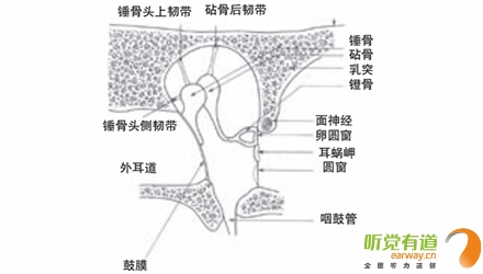 <span style="font-size:16px;"> 中耳結構包括鼓室、咽鼓管、鼓竇和乳突腔四部分。鼓室內有聽骨、肌肉、韌帶和神經。中耳是換能器,換能是將一種能量形式轉換成另一種能量形式,中耳通過鼓膜和聽骨鏈將聲能轉換為機械能,再由鐙骨底板將機械能轉換為內耳的液態能。</span></p><p><span style="font-size:16px;"> 鼓膜是中耳和外耳的分界,呈橢圓形,中間稍向內凹陷,色灰白,較透明,與耳道底約呈30°角。鼓膜寬約8mm,高約9mm,厚0.1mm,質地韌,其構造分三層:外層是皮膚層,中層由淺層的放射狀和深層的環狀纖維組成,它們使得鼓膜能承受一定的氣壓和水壓并抗感染,內層為粘膜層,與鼓室粘膜相連續。聲音的振動,即聲能,通過耳郭和耳道共振的加強,引起鼓膜隨之振動,鼓膜與中耳的錘骨相連,在正常耳,錘骨懸掛在自鼓膜頂端至下2/3處。錘骨柄的尖端將鼓膜頂向中耳,形成錐形鼓膜的頂,稱作臍。自臍向前下達鼓膜邊緣有一個三角形的反光區,名光錐,是外來光線被鼓膜的凹面集中反射而成。鼓膜下4/5為緊張部,上1/5由于缺乏纖維層而較松馳,稱為松弛部。鼓膜可分為前上、前下、后上、后下四個象限。兒童的鼓膜薄而有彈性,年齡越大,鼓膜越厚且越僵硬。鼓環將鼓膜固定在某一位置,使其成為在外耳和中耳之間的一層防水防氣的屏障。</span></p><center><span style="font-size:16px;"><img alt="" src="/upfiles/201810080137189845.png" width="440" height="250" /></span></center><p></p><p><span style="font-size:16px;"> 中耳鼓室</span></p><center><span style="font-size:16px;"><img alt="" src="/upfiles/201810080137242362.png" width="440" height="250" /></span></center><p></p><p><span style="font-size:16px;"> 正常鼓膜像(左)</span></p><p><span style="font-size:16px;"> 在中耳腔內的聽骨是人體最小的骨頭,分別叫作錘骨、砧骨和鐙骨。這些聽骨由韌帶連接并懸掛起來形成了聽骨鏈。錘骨柄附在鼓膜上,錘骨頭與砧骨頭形成錘砧關節,砧骨底與鐙骨頭形成砧鐙關節,鐙骨底板由環狀韌帶固定在卵圓窗上。聽骨鏈利用杠桿原理使來自鼓膜的機械能放大,傳遞到卵圓窗。</span></p><center><span style="font-size:16px;"><img alt="" src="/upfiles/201810080137303051.png" width="440" height="250" /></span></center><p></p><p><span style="font-size:16px;"> 聽骨鏈</span></p><p><span style="font-size:16px;"> 咽鼓管是中耳通氣引流的唯一途徑,也是中耳感染的主要途徑。它的一端開口在較高的中耳鼓室腔,另一端開口在較低的鼻咽部,通過咽鼓管在鼻咽部的開口,空氣可從外界直接進入中耳腔。咽鼓管平時處于關閉狀態,能較好的防止細菌感染,只有在咳嗽、擤鼻涕、打哈欠或吞咽時,咽鼓管才開放。當咽鼓管開放時,根據鼓膜外側的壓力情況,空氣或者從中耳流向外界,或者從外界流向中耳,使中耳壓力得以平衡。</span></p><p><span style="font-size:16px;"> 更多詳情請登錄m.huiyoutank.com</span></p>" />