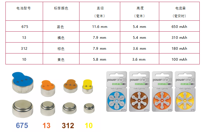 助聽器電池有四種型號:10,13,312和675。助聽器電池由各種制造商生產并具有各種尺寸。耳背式(BTE)助聽器通常需要13和312電池,而耳內(ITE)助聽器往往需要較小312和10號。